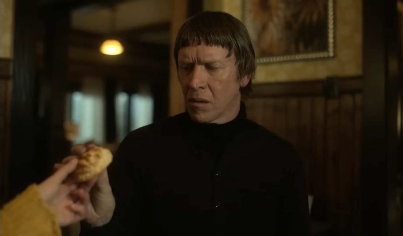 If Season 5 stands against false faith, it also stands against “no faith.” One of the kidnappers hired by Roy is a man named Munch. Munch is of Welsh descent and wears a kilt. He’s a ruthless killer with a chilling presence. Munch is a nihilistic atheist who believes in “nothing” (Episode 2). Yet in Episode 3, we find out that Munch is a 500 year-old “sin-eater.” We get a flashback to 1522 where Munch performs a ritual of eating (or munching) the sins of a deceased man. The ritual then causes an evil curse to be placed on Munch. (While this may seem like a strange plot line, Fargo typically includes supernatural elements in each season.)