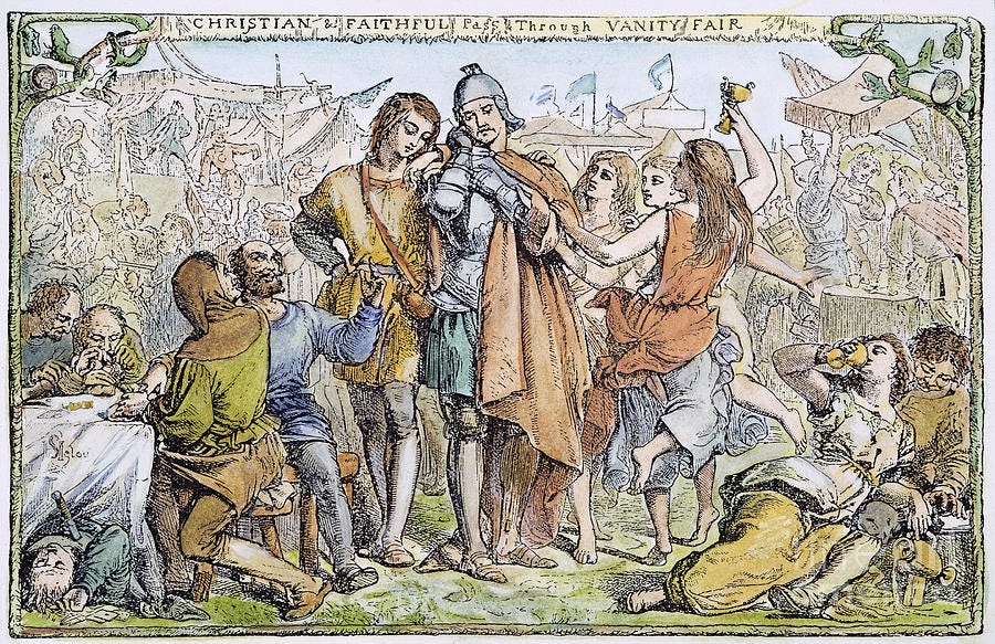 As Pilgrim and Faithful passed through the town of Vanity Fair, they created a “hubbub.” Pilgrim and Faithful dressed and spoke differently from the townspeople and refused to purchase the fleeting pleasures being peddled there. Upon being asked, “What will ye buy,” the Christians responded, “We buy the truth.” (Proverbs 23:23) At this answer, the people of Vanity Fair railed against the Christians, beat them, caged them, arraigned and tried them, and eventually murdered Faithful.