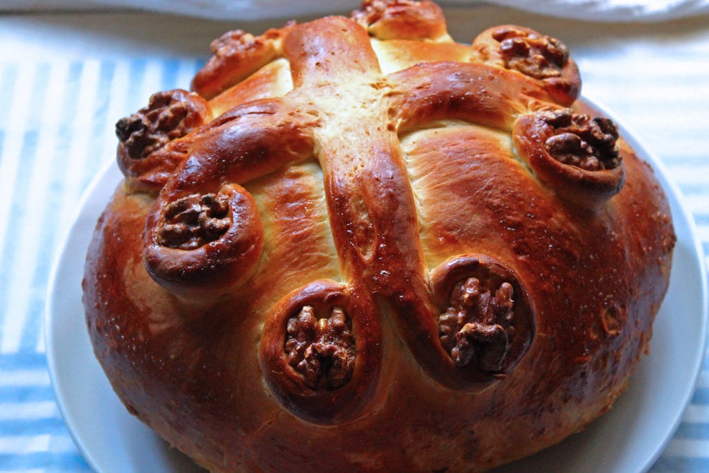 The rising process that the bread undergoes during its preparation is seen to be a representation of the rising of Jesus Christ, the Bread of Life. The top of the bread is often decorated with a large ‘X’, a reference to the first letter of Christ as it is spelled in Greek: Χριστός (Christos). A smaller symbol of a cross is also added to represent Christ’s death and resurrection. Representations of shepherds, sheep, oxen, wheat, etc. can also be found on these Christmas loaves.