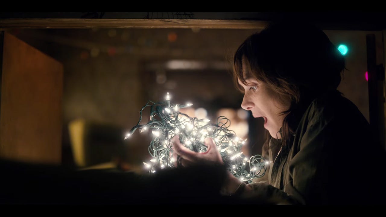One major aspect of the show is that lights flicker when the monster comes near. Jonathan described it to Nancy as, “The lights speak.” Indeed they do, especially for Will. He can use the lights to communicate with his mother. When Joyce realizes this she says, “I need more lamps.” She buys Christmas lights and strings them up all over the house so Will can send her messages.