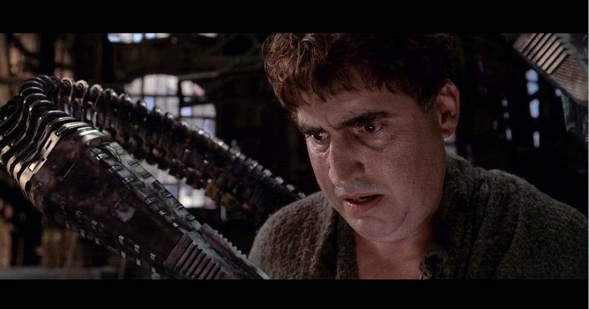 In the second movie, Doctor Otto Octavius develops automated arms that he can plug into his nervous system to control them to perform an experiment. The arms have an artificial intelligence that could control Octavius except for a chip that restrains them. When the experiment goes wrong, the chip is destroyed.