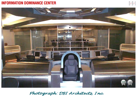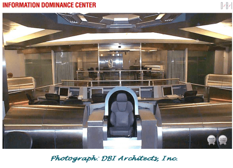 “When he was running the Army’s Intelligence and Security Command, Alexander brought many of his future allies down to Fort Belvoir for a tour of his base of operations, a facility known as the Information Dominance Center. It had been designed by a Hollywood set designer to mimic the bridge of the starship Enterprise from Star Trek, complete with chrome panels, computer stations, a huge TV monitor on the forward wall, and doors that made a ‘whoosh’ sound when they slid open and closed. Lawmakers and other important officials took turns sitting in a leather ‘captain’s chair’ in the center of the room and watched as Alexander, a lover of science-fiction movies, showed off his data tools on the big screen.